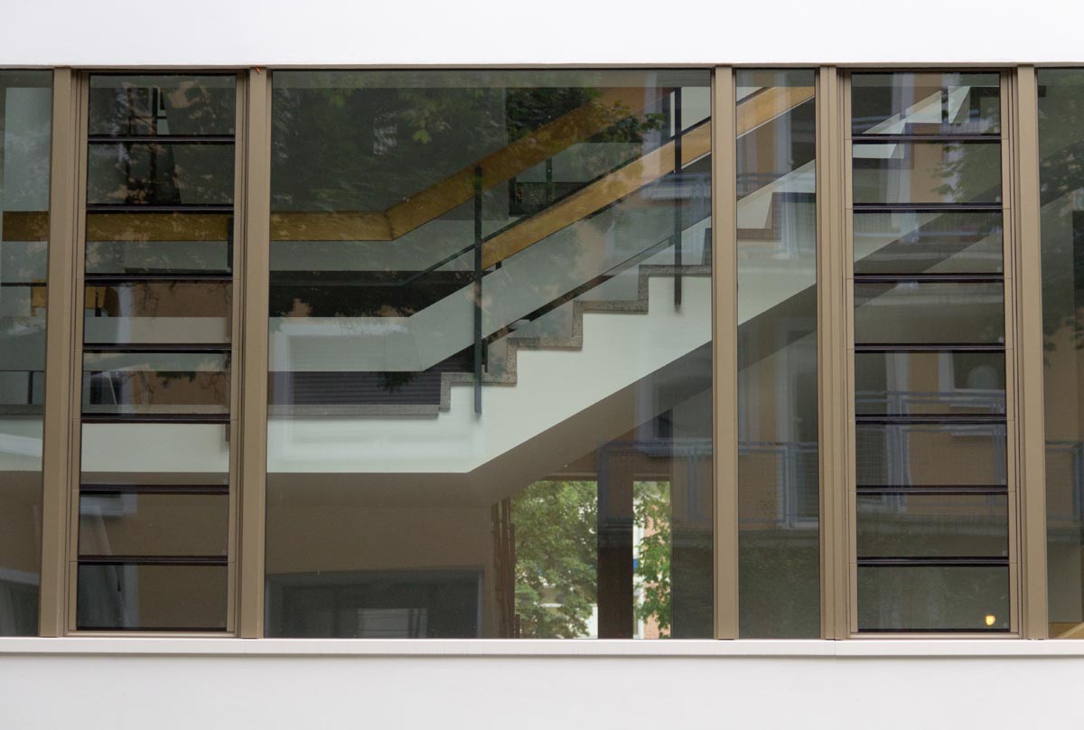 Leitidee des Fassadenentwurfs ist die horizontale Bänderung der Fensterflächen bei den Klassenzimmern und Verwaltungsfassaden. Durch die Bänderung wächst das Haus stärker zusammen. Die horizontale Bänderung wird durch aufgesetzte weiße Putzflächen unterbrochen, die das Haus rhythmisieren.