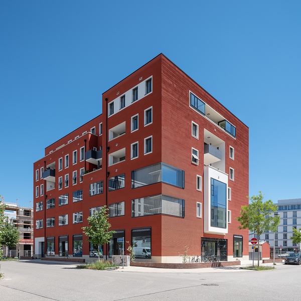 Am Freiburger Güterbahnhofsgelände entstand ein hybrides Bauwerk mit Gewerbeeinheiten im Erdgeschoss, zwei Büroetagen sowie drei Wohngeschossen.