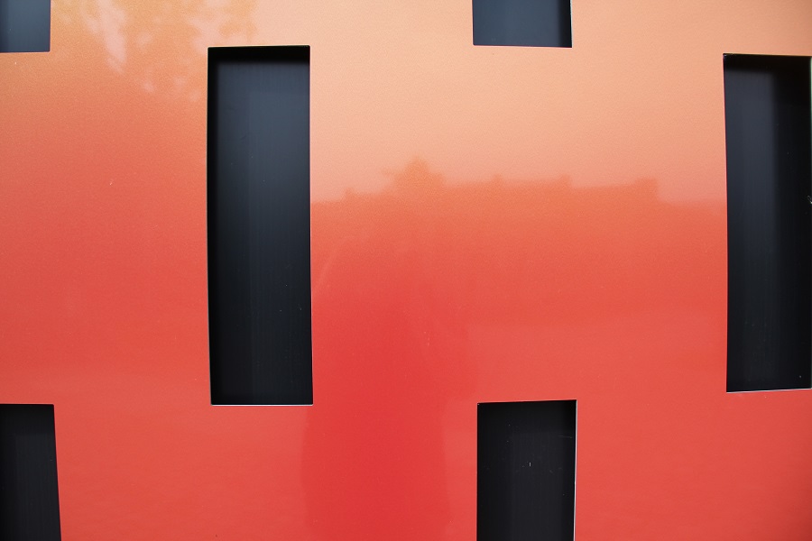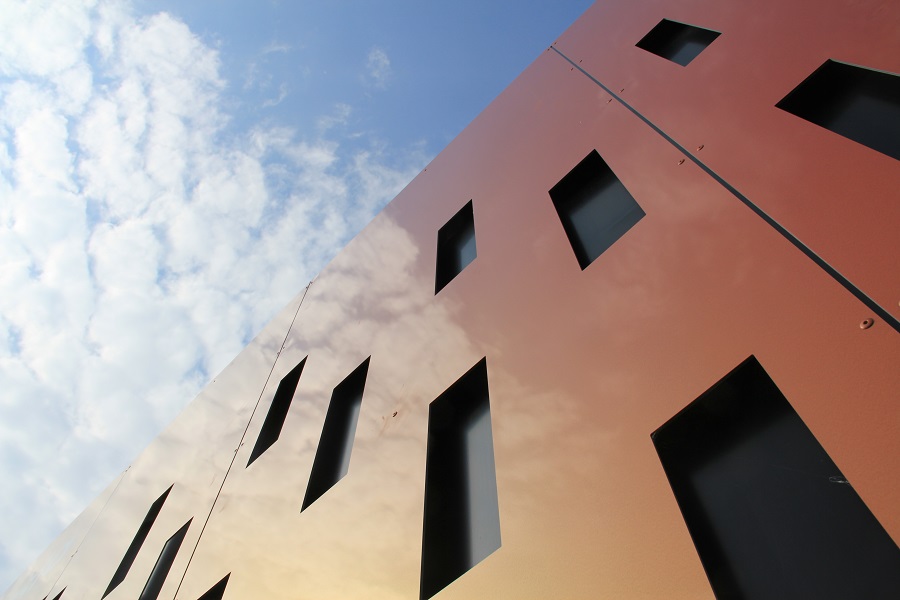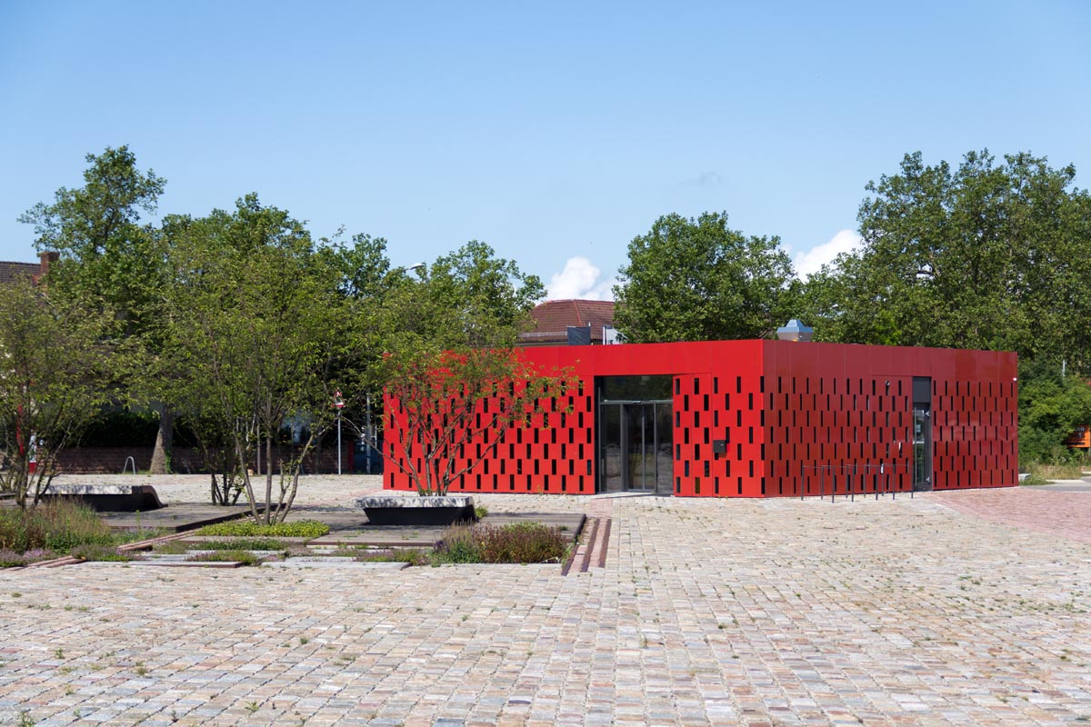 Der Pavillon bildet die zentrale Anlaufstelle sowie den Auftakt zum neuen Baugebiet des ehemaligen Güterbahnhofareals. Der prägnante Kubus und die in Rottönen changierende Farbgebung der Metallfassade bringen dem Gebäude maximale Aufmerksamkeit.