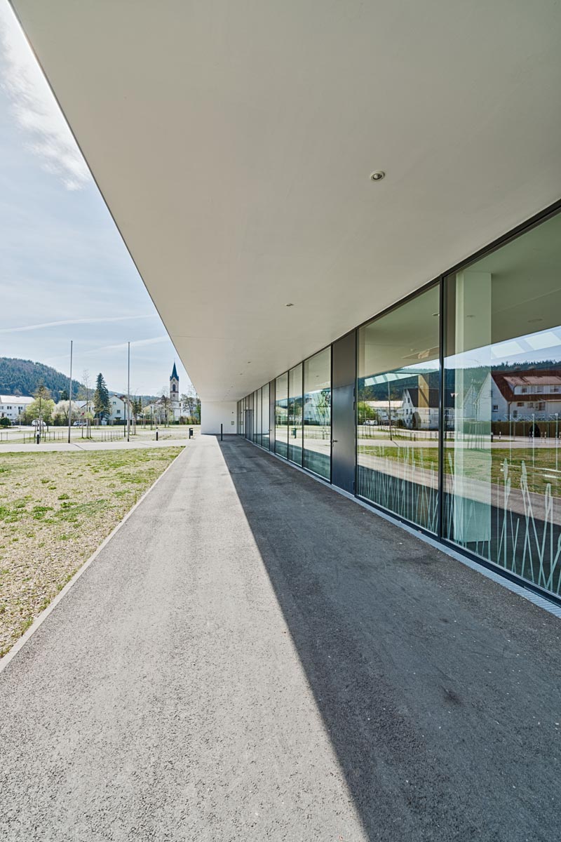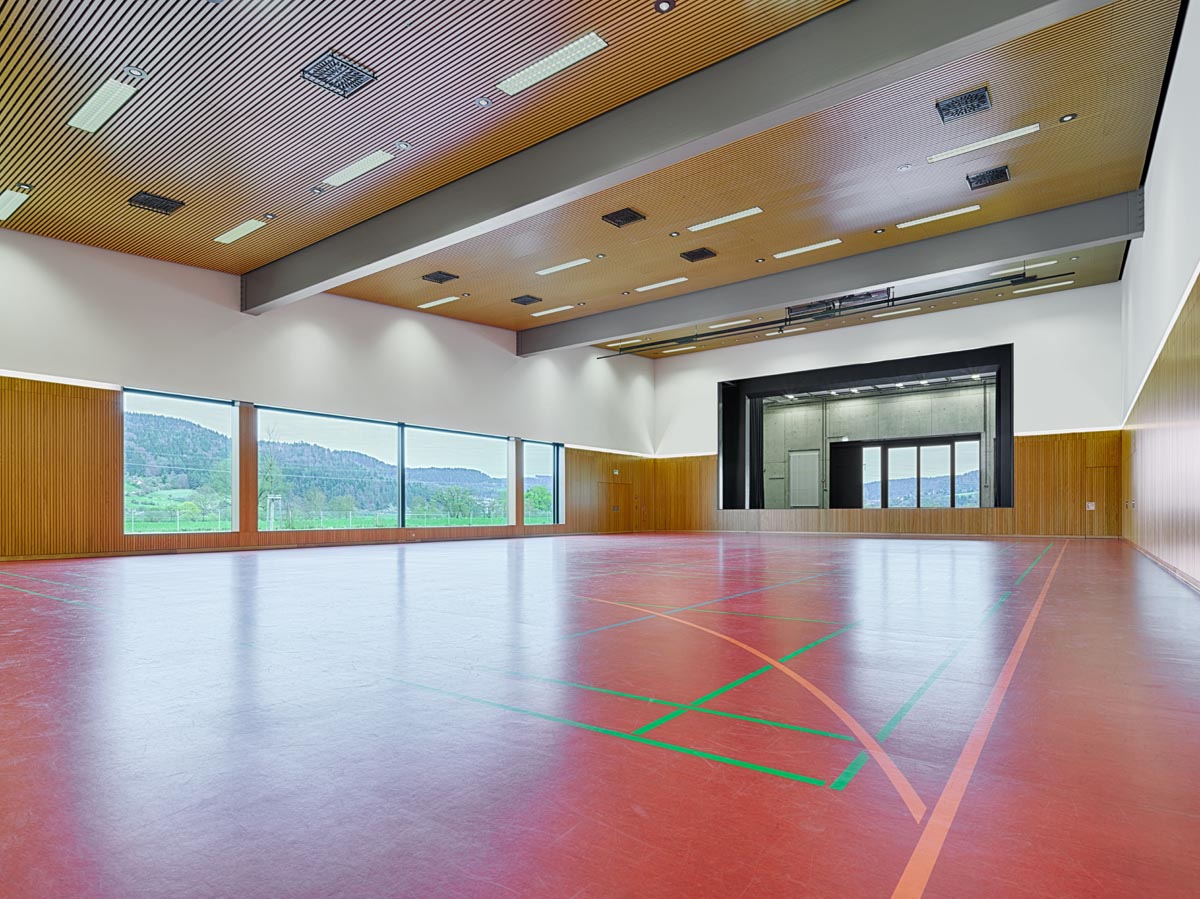 Der Mehrzwecksaal liegt mit der Längsseite parallel zum Foyer und bietet über ein großes Panoramafenster einen Außenbezug zur Donaulandschaft. Die Besonderheit der Bühne besteht in ihrer Multifunktionalität. Sie ist als volltauglicher Gymnastikraum durch eine mobile Trennwand, die Saal und Bühne bei Sportbetrieb in zwei separat nutzbare Räume verwandelt, abtrennbar. Daher ist der Bühnenbereich auch mit einer großzügigen Verglasung versehen. Im Falle einer kulturellen Bühnenveranstaltung, lässt sich die Trennwand als akustische Reflektionsfläche in den Bühnenhintergrund ziehen.