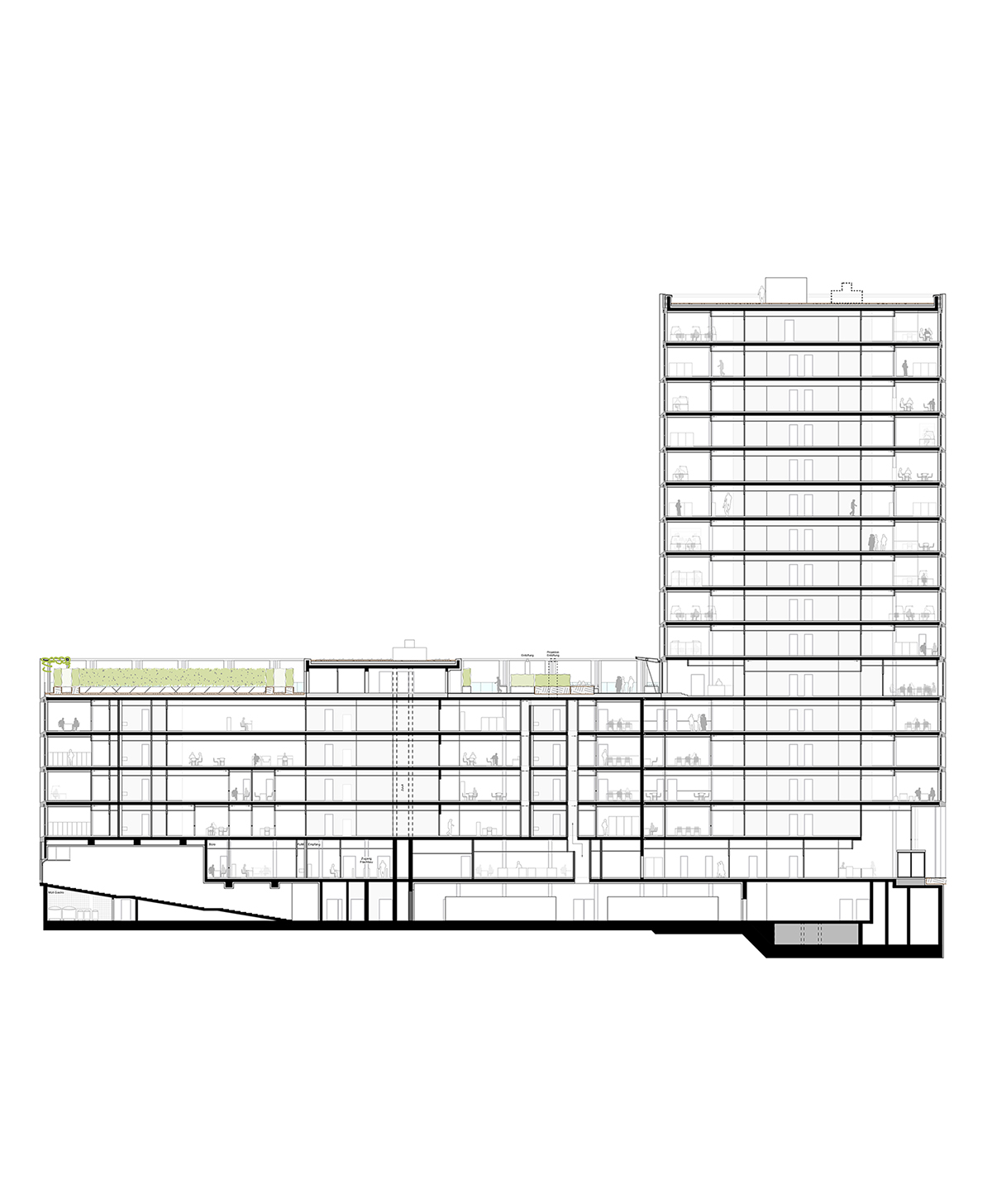 Der Gebäudeabschluss erfolgt im Hochhaus über ein zusammengefasstes Doppelgeschoss als `Stadtkrone´.