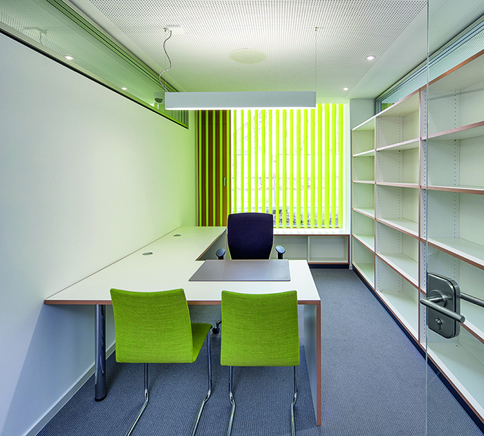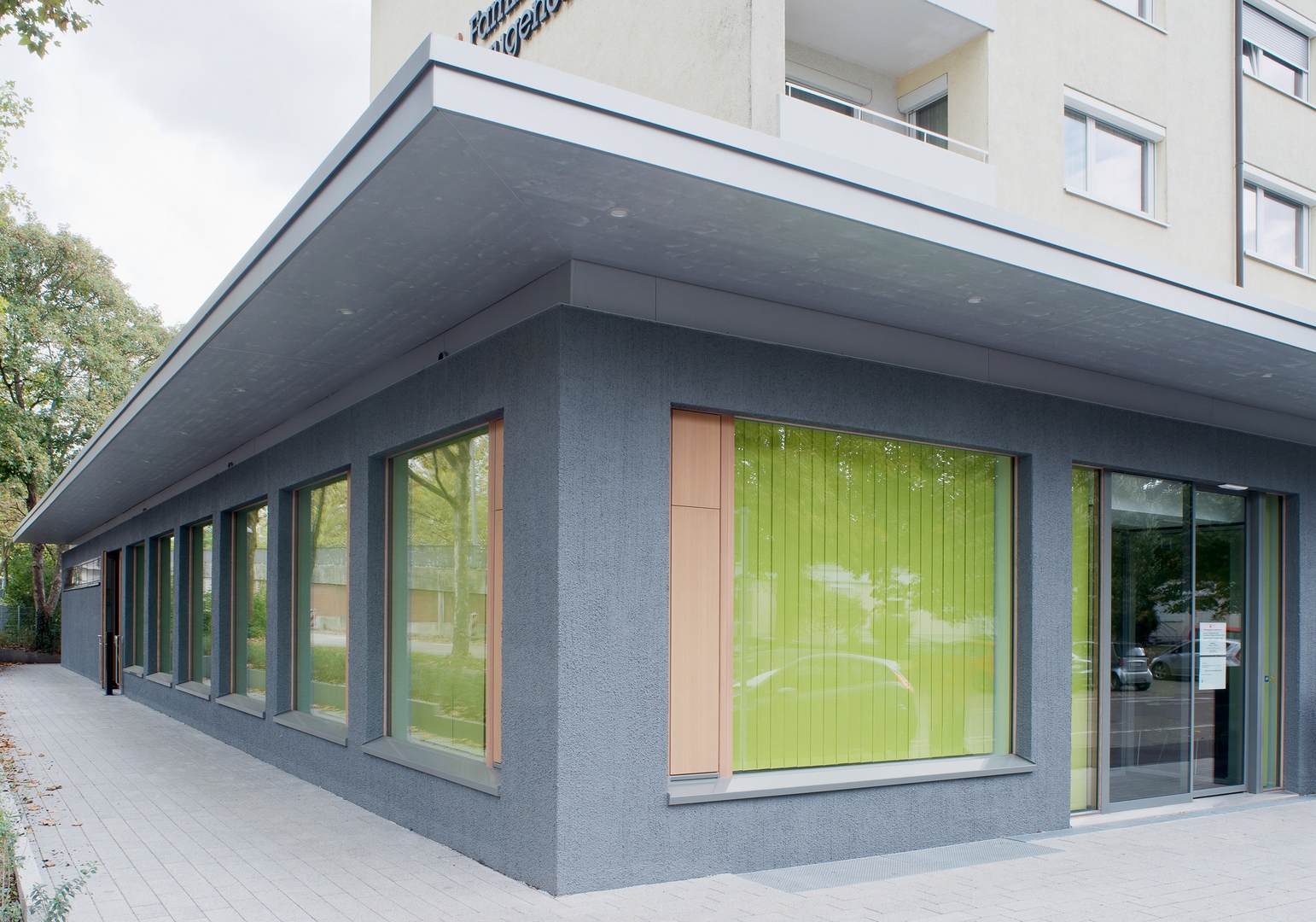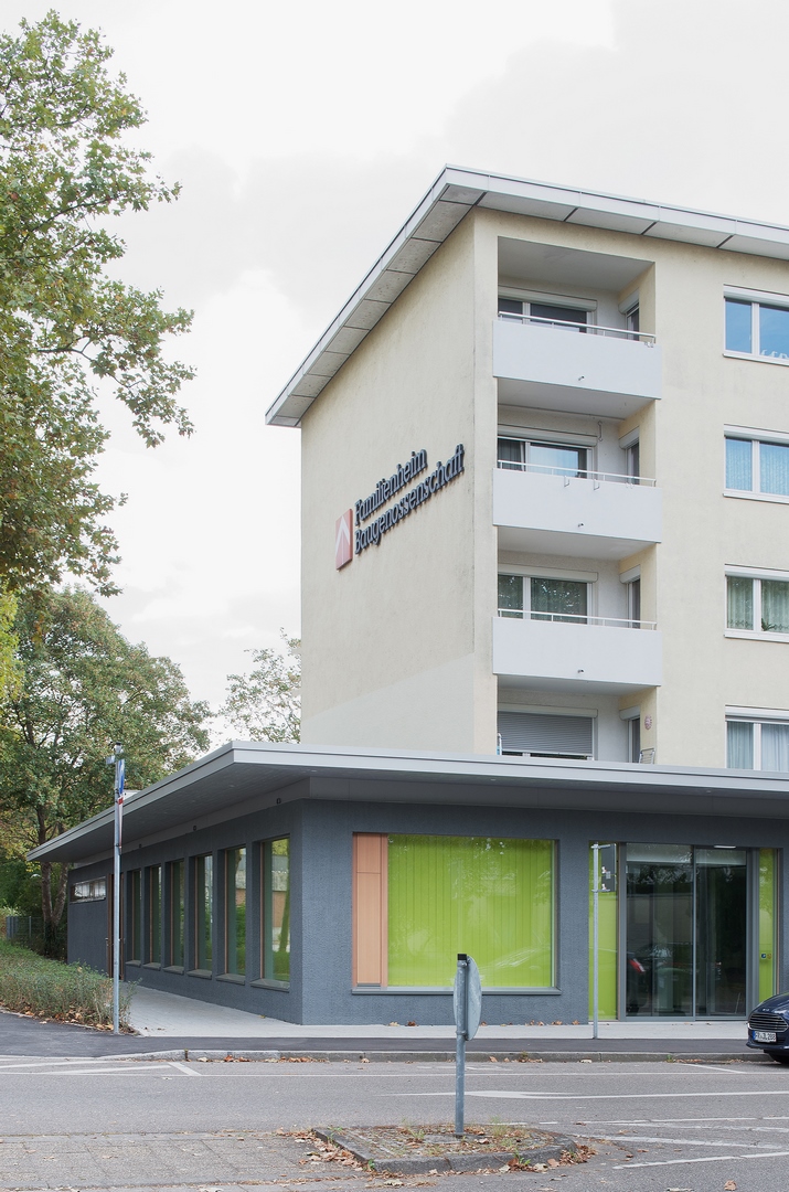 Ein Pavillonanbau mit ehemals zwei Gewerbeeinheiten wurde mit direktem Anschluss an die Geschäftsstelle zu einem Servicezentrum der Baugenossenschaft Familienheim umgebaut, in dem Mieter und Mitglieder ihre Ansprechpartner zentral aufsuchen können.