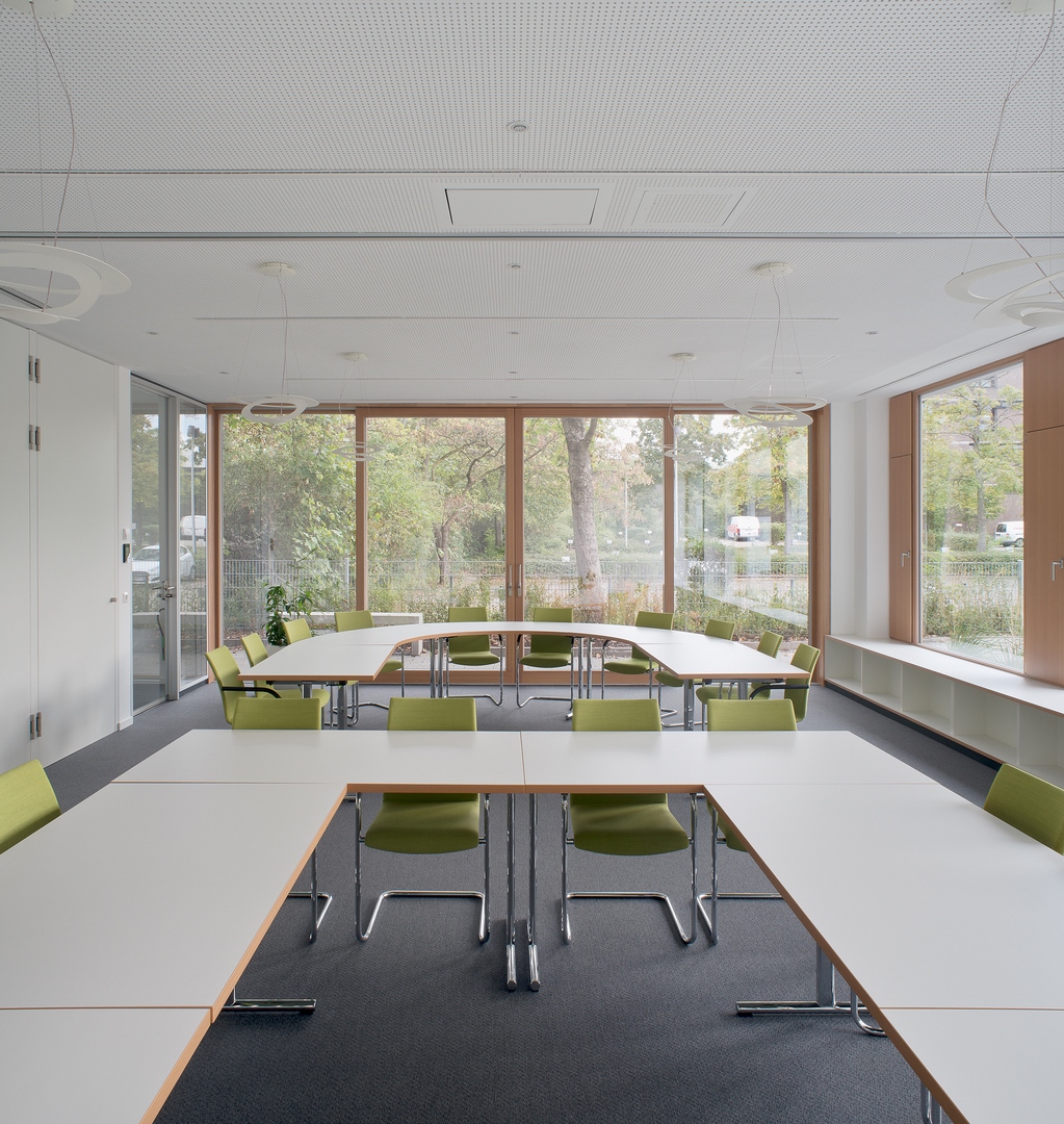 Während der Baukörper zur stark befahrenen Sundgauallee eine klare Abgrenzung vornimmt, ist der rückwärtig gelegene Vortragsraum luftig und offen zum Garten mit seinen Laubbäumen ausgerichtet.