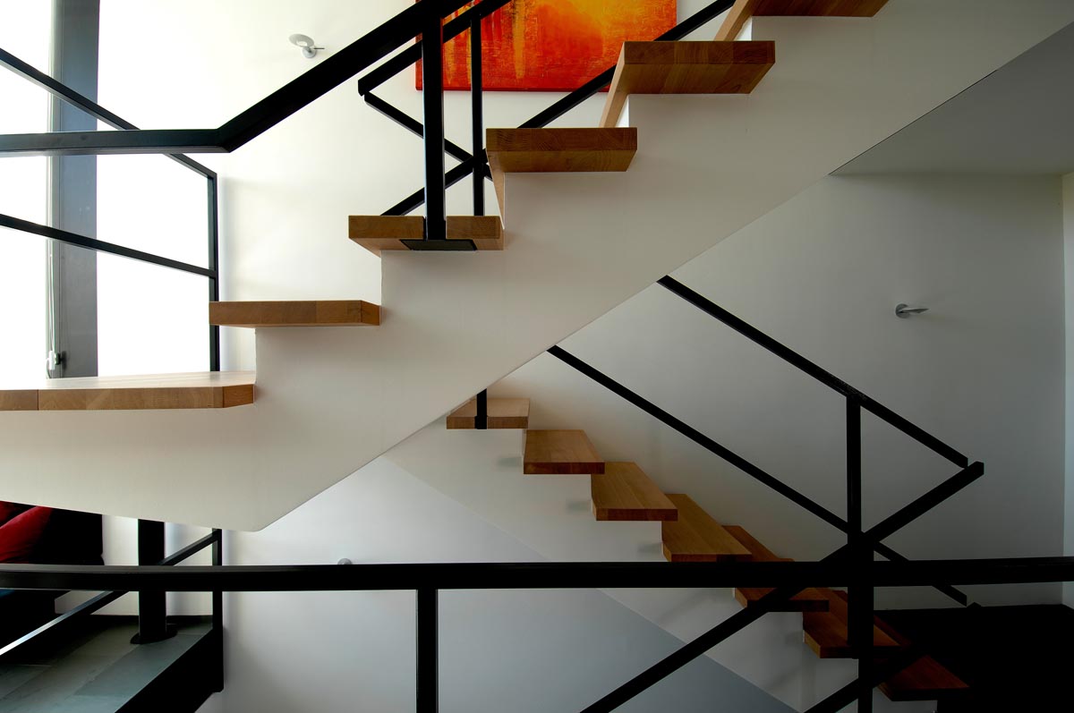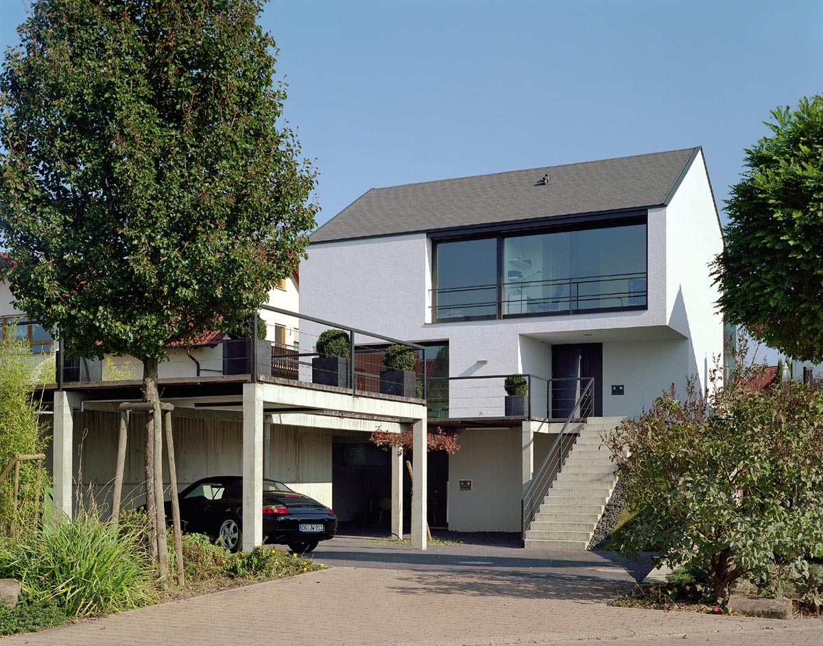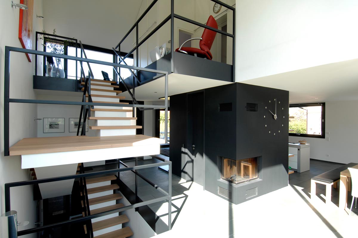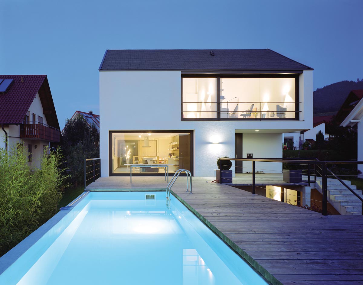 Das Wohnhaus steht selbstbewusst in einem typischen Neubaugebiet am Ortsrand von Ortenberg. Die vorhandene Topographie des Grundstücks ermöglicht eine in den Hang integrierte, dreigeschossige Bebauung. Der attraktiven Aussicht in die Rheinebene entsprechend öffnet sich das Haus gegen Süd-Westen mit großen Fensterformaten. Gegenüber dem Straßenniveau erhöht, liegen die vorgelagerte Holzterrasse und der Swimming Pool. Im Inneren leben die Räume vom spannungsvollen Wechselspiel zwischen geschossübergreifender Transparenz und intimen Rückzugsmöglichkeiten. Die Gestaltung ist geprägt von Klarheit und Ruhe in der Form, sowie von Präzision im Detail. Die Wahl der Materialien erfolgte mit der gleichen Haltung, was dem Gebäude ein klassisch-modernes Erscheinungsbild verleiht.